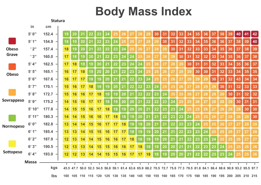Vedi la tabella per scoprire subito il risultato consultando l'asse dell'altezza per l'asse del tuo peso.